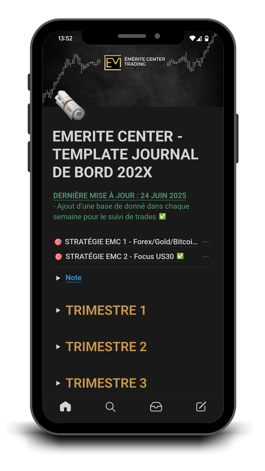 Grâce à notre journal exclusif, vous suivez vos stratégies, évaluez vos performances et analysez vos résultats à chaque étape : journalière, hebdomadaire, mensuelle, trimestrielle et annuelle.